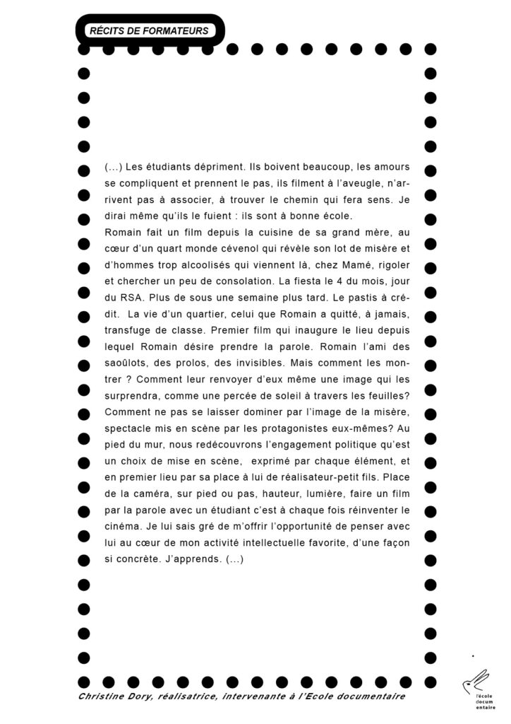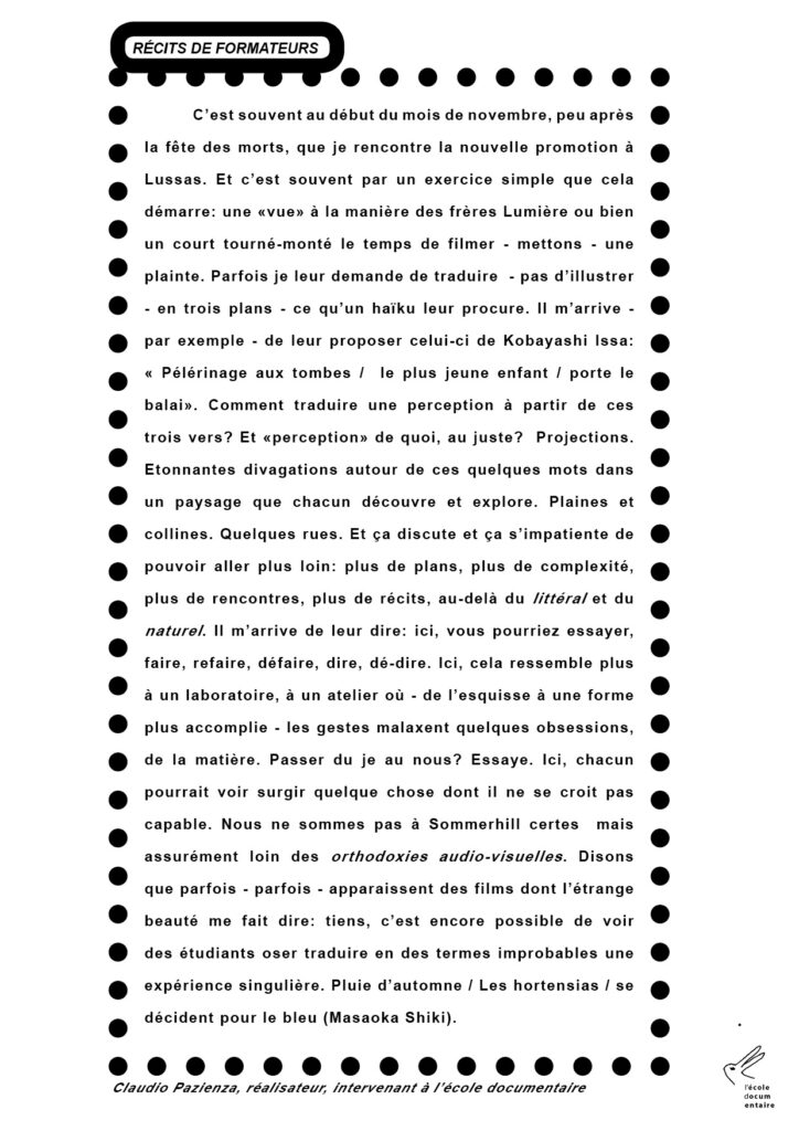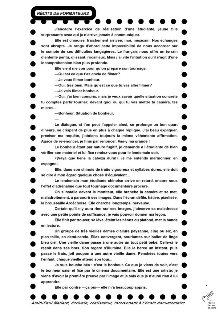 L’essentiel du travail des formateurs est d’être à l’écoute des réalisateurs, parfois d’aller chercher chez les étudiants l’intuition — voire le désir — d’un film qu’ils ne seraient pas encore en mesure d’énoncer puis de les aider à identifier — ou inventer — une forme pour véhiculer ce qu’ils voudraient que leur film raconte. Les étudiants partent sur le terrain avec des intentions précises et énoncées. De leur tournage, ils rapportent quotidiennement des images et des sons. Le visionnage critique de cette matière avec les formateurs leur permet de re-penser le dispositif  afin que le réel réponde avec le plus d’éloquence possible aux questions posées par le cinéaste. L’enjeu : apprendre à raconter la réalité avec un point de vue, sans la trahir. » Emmanuel Parraud et Alain-Paul Mallard