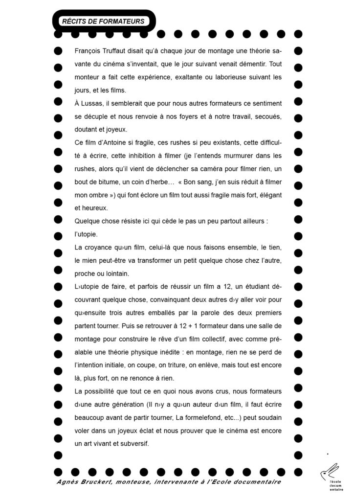 » Comment se fait un film à plusieurs ? Est-ce additionner les regards? Est-ce collectionner les subjectivités? C’est avant tout, expérimenter une autre poétique du cinéma qui associerait pédagogie et politique. A l’école documentaire de Lussas, les étudiants du Master 2 Documentaire de création se confrontent à cette pratique du film collectif. Un temps d’apprentissage de 7 semaines pendant lequel « réaliser » s’invente et se définit au moyen de l’appropriation collective des outils d’expression.  » Pierre Hanau