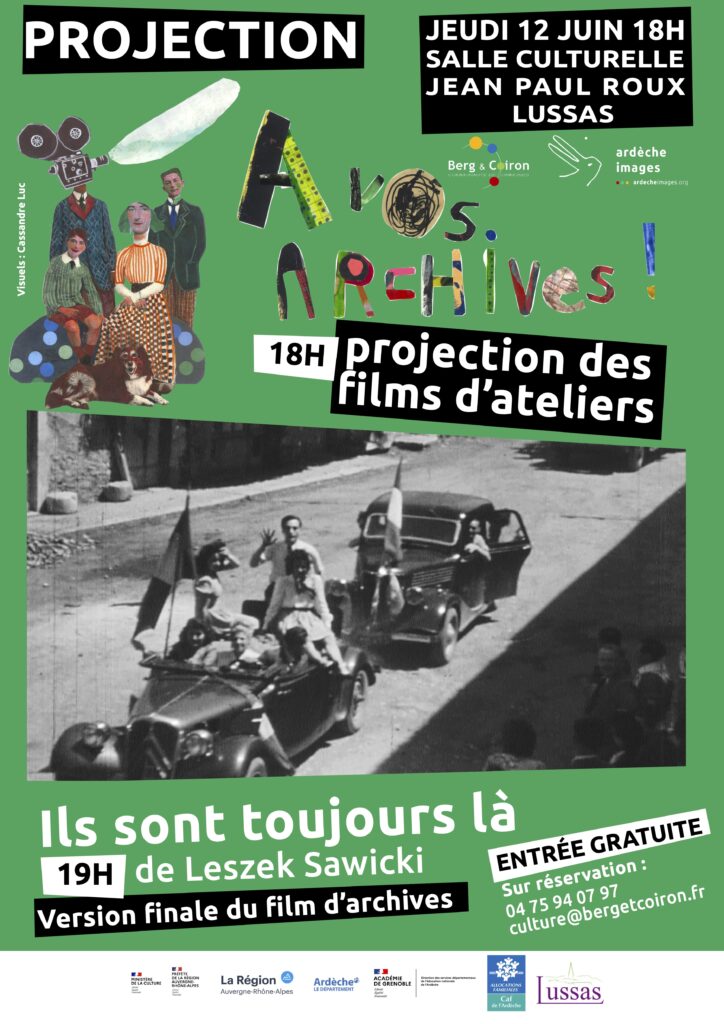 Le samedi 24 mai à 14h30 a eu lieu la projection de restitution des films d’ateliers qui ont été réalisés avec les archives collectées sur le territoire de Berg et Coiron. Cette projection a été suivie d’une rencontre exclusive avec le réalisateur Leszek Sawicki et de la présentation de son film en cours de montage Ils sont toujours là – Partie 1 à 16h45.