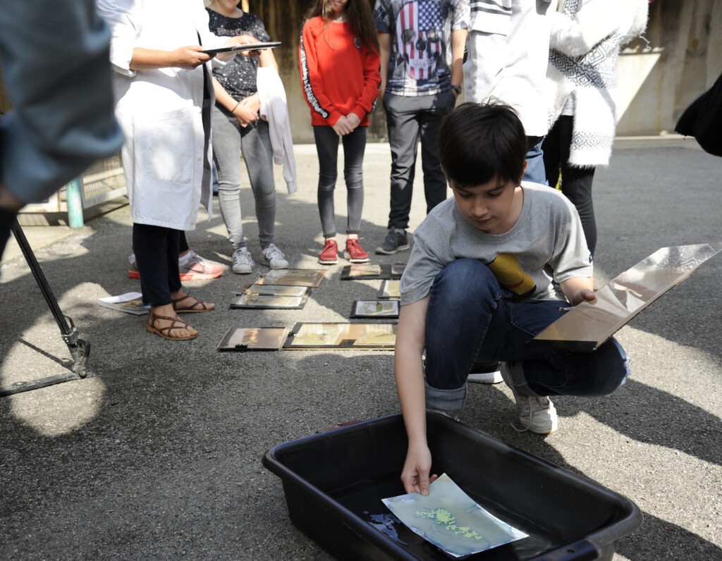 – une sensibilisation à des pratiques artistiques du son, de l’image fixe et en mouvement, à travers différentes techniques : des plus anciennes avec le cyanotype (ancêtre de la photographie qui se fabrique à partir de la lumière du soleil sans appareil photo) aux plus récentes avec la video.